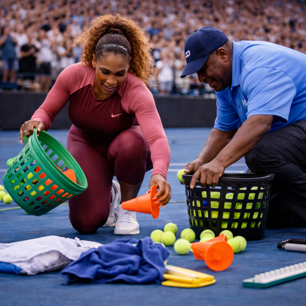 Instead of returning to her position, tennis legend Serena Williams stepped forward, walked across the court, and knelt down beside the cleaner to start collecting the equipment herself.