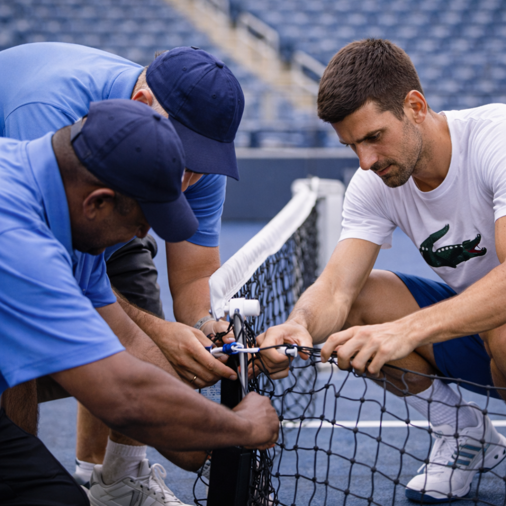 Djokovic quietly grabbed one side of the net cord and held it firmly in place, giving the staff the support they needed to finish the adjustment more quickly.